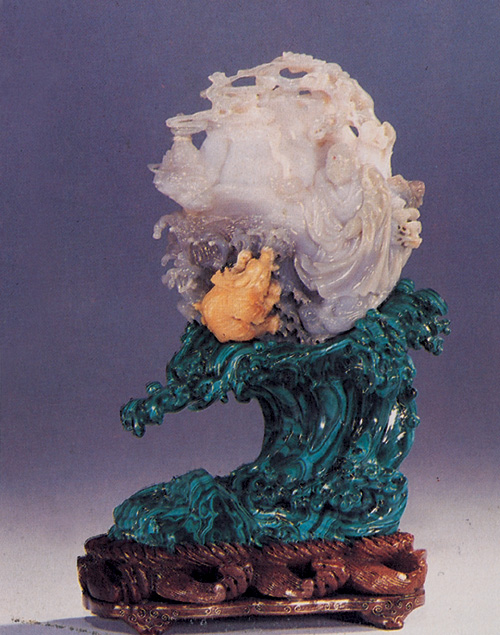 例如附圖的「巨浪降蛟」雕塑品,乃近代著名工藝師的代表作之一。上方部分用「水膽瑪瑙」;中間巨浪部分用綠色孔雀石;下方的座則用褐紅瑪瑙。