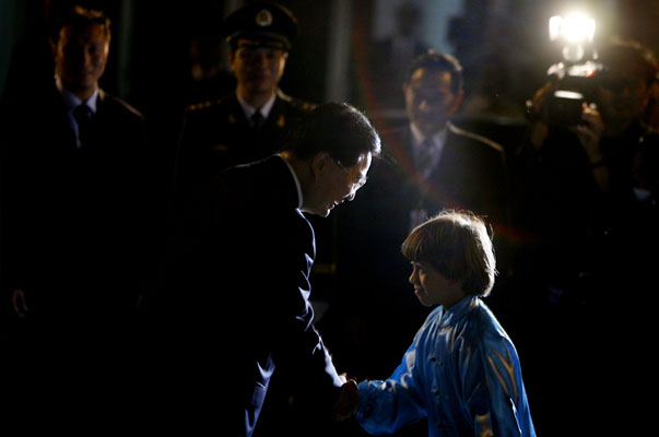 圖:一位古巴兒童穿着中國傳統服裝在機場歡迎胡錦濤的到訪 (美聯社)