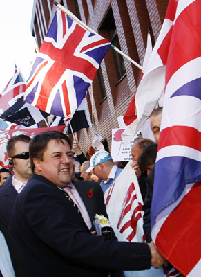 圖:英國國家黨黨魁尼克·格里芬接受支持者們祝賀(路透社)