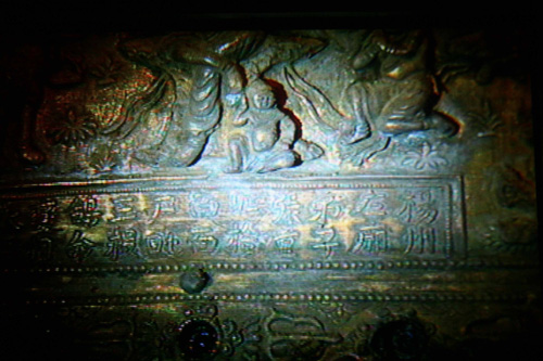 圖:南京大報恩寺遺址地宮發現的神秘鐵函內的鎏金七寶阿育王塔二十二日成功被請出鐵函,驚世亮相。這是中國目前發現的最大鎏金七寶阿育王塔,據信塔中珍藏有金棺銀椁及舍利等驚世聖物。圖為塔身文字和圖案 (中通社)