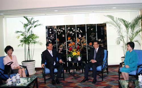 圖:中共中央總書記胡錦濤首次偕夫人劉永清與中國國民黨榮譽主席連戰和夫人連方瑀會見,這也是在中國大陸以外的地方首次舉行的「胡連會」(中新社)