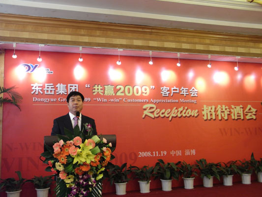 圖:東岳集團董事長張建宏出席東岳集團「共贏2009」客戶年會時表示,預計東岳氟硅材料產業園區(包括非上市公司企業)今年的營業額可達70億元人民幣(本報攝)
