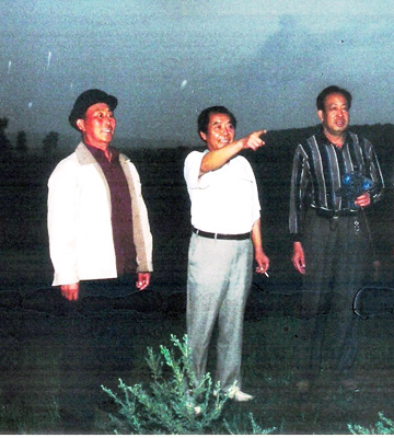 圖:公司負責人(右一、右二)在山西林學院治沙專家的陪同下,考察沙漠腹地的檸條生長情況