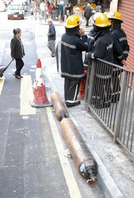 意外發生在昨日上午九時十九分,一輛貨車駛經西環東邊街上斜時,疑潘姓司機(四十九歲)和工人沒鎖好放在車斗的風煤樽,行車期間突然跌落路面,但車上眾人仍懵然不知。兩樽高約五呎、直徑半呎的風煤樽在斜路打滾,至接近皇后大道西交界撞向行人路旁石壆始停下。其中一樽發出吱吱響聲,路人恐會爆炸報案,警員趕至亦束手無策,為安全計封閉上址路段,轉知消防處派員到場協助,消防員趕至即時拉喉戒備。