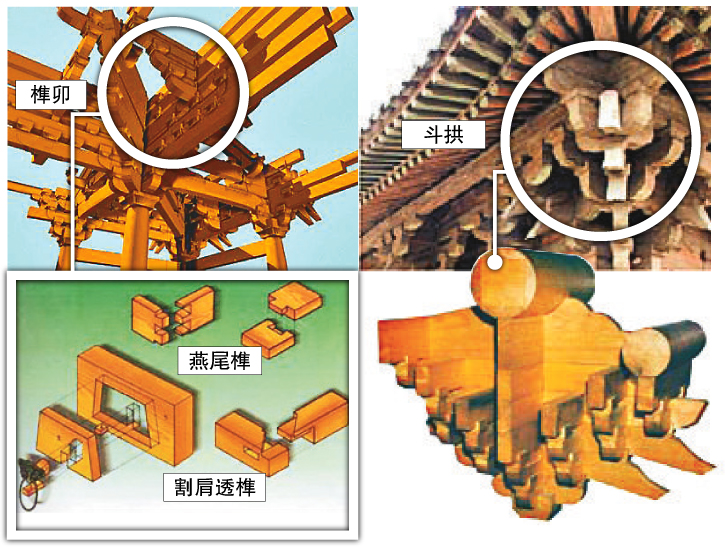 以構件的凹凸處相嵌的接合方式稱為「榫卯」。從浙江河姆渡出土的榫卯殘木推測,7000年前先民已掌握木構榫卯技術。古代一些技術高超的工匠不用一枚鐵釘,完全靠榫卯連接眾多木構件,蓋起龐大的建築。中國現存最古老全木結構建築—山西省應縣木塔,即完全依靠斗拱、柱樑嵌合,歷經千年而屹立不倒。榫卯技術體現了古人卓越的創造力,是木構建築體系的技術關鍵,也是這一體系區別於世界其他古代建築體系的特點所在。