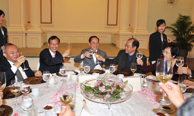 行政長官曾蔭權(左三)昨日在禮賓府設午宴款待立法會議員,加強議員和特區政府官員的聯繫和溝通。圖為曾蔭權向眾人祝酒。(政府新聞處圖片)