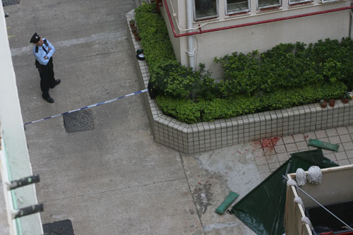 圖:警員在跳樓案現場調查(本報攝)