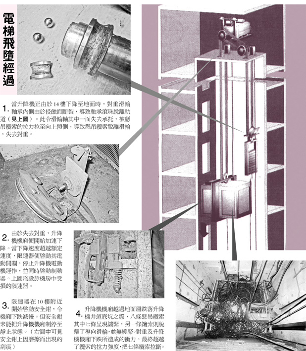 升降機下跌的衝力,拉斷七條懸吊纜索,五條補償繩索則散落在升降機箱的頂部和側邊。報告稱,據測試結果顯示,肇事升降機的懸吊纜索的抗拉強度符合製造商的技術規格,和該升降機的安全操作要求。