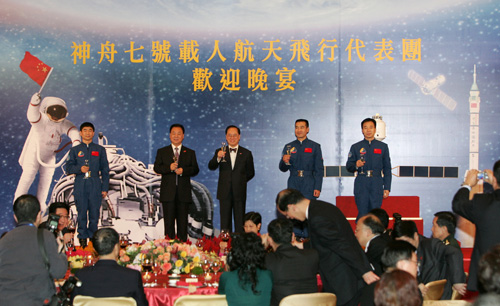 晚宴開始時,穿着整齊藍色航天服的航天員翟志剛、劉伯明、景海鵬和代表團團長張建啟,以及行政長官曾蔭權在音樂聲和熱烈掌聲的襯托下昂然進場,航天員報以燦爛笑容。其後場上播放了航天員升空和太空漫步的精華片段,當嘉賓看到翟志剛在太空揮動國旗的一幕,全場掌聲如雷。