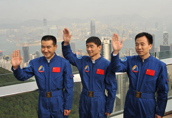 隨後,代表團一行登上凌霄閣閣頂,維多利亞港兩岸的美景,立即征服了飽覽過太空風光的航天員。第一位在太空漫步留下足跡的中國航天員翟志剛,禁不住連聲稱讚「香港漂亮!非常漂亮!」他說,遊覽過香港的美好風光,感受到香港能發展成為大都市,是集合了香港人的智慧和奮鬥得來,他以自己在太空開艙門時遇到困難,但在隊員合作下,艙門終於成功打開。他寄語香港市民,憑着聰明才智,最終定能順利渡過當前的經濟難關,定能打開經濟輝煌的大門。