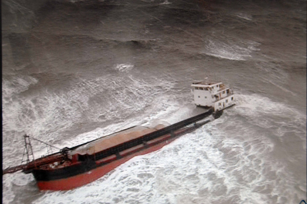 十日三時三十分,唐山附近海域一運沙船船體進水傾斜,船上六人,由於海上風浪太大,船員準備棄船。交通運輸部北海第一救助飛行隊飛行隊救助直升機立即馳援,將六名遇險漁民救起。(中新社)
