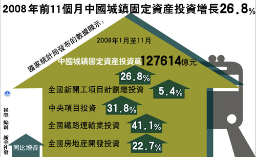 國家統計局周二公布,今年一至十一月,中國城鎮固定資產投資同比增長26.8%,與市場預期相符。這一數據雖然較一至十月27.2%的增幅繼續回落,但考慮到投資品價格的回落,實際增長仍然保持平穩。另一方面,穆迪發表研究報告稱,中國固定資產投資放緩趨勢將至少維持六個月,主要是內地出口停滯、房地產開發減緩和新建項目不足。