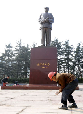 圖:湖南省湘潭市韶山沖毛澤東銅像移位及廣場改擴建工程將於12月25日全面竣工,目前主體工程已基本完成,廣場也進入最後的清整階段。圖為15日,一名工人在毛澤東廣場進行地面清整施工(新華社)