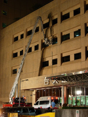 許多消防員都是第一次到醫院救火,像繞迷宮般煞費工夫找不到起火點;雖然火勢不大,但煙霧愈來愈大,消防人員打破窗戶,讓空氣流通。因擔心帶有環氧乙烷的毒氣隨着煙往高樓層竄,四樓以上人員全部緊急疏散。霎時醫院大廳,擠了百多張病床。