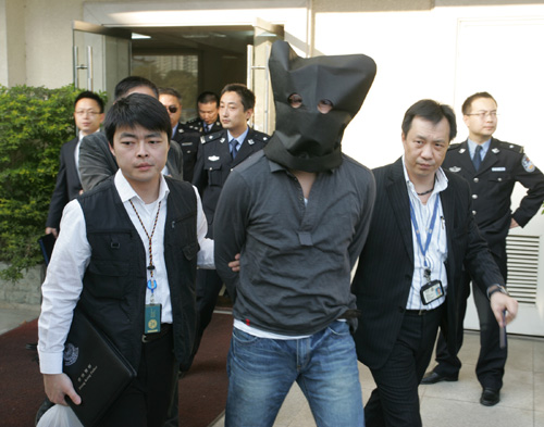 昨日下午四時,戴手銬蒙黑頭套的蔡錦輝由兩名便衣警員押着過關,移交給香港警方。
