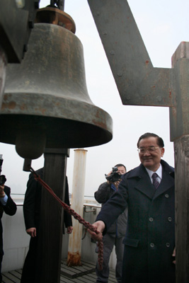 中國國民黨榮譽主席連戰20日登上上海世博大廈頂樓,俯瞰世博園區全景。連戰在上海世博大廈樓頂敲響「世博和平鐘」,企盼兩岸和平,臨別還欣然為上海世博會題詞:「城市多元與世融合,生活全面向上飛升。」(新華社)