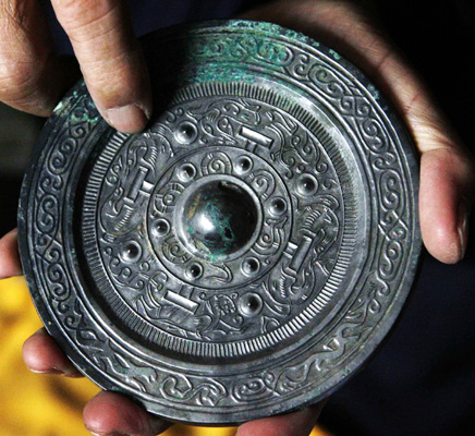 22日,河南一位銅鏡收藏者展示漢代王莽時期的規矩鏡。這種在王莽時期改革創造的鏡種,直徑12.3厘米,中區有六乳、外四乳,邊緣紋飾複雜,顯示出規矩鏡迎合了新朝權貴在政治上崇古的主張。(中新社)