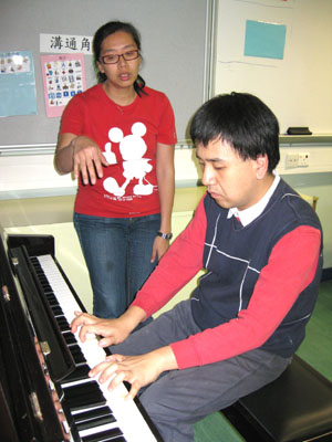 黃昏時分,步進匡智會的一間課室,聽到悠揚流暢的鋼琴音樂,一個大男孩正在這裡排練,由於他是面壁而彈,背對着記者,因此完全不覺他和平常人有何分別。匡智健樂會職員謝潔明在旁嚴格地指導,一會兒說太大聲,一會兒又說彈得很亂,大男孩都很聽話的繼續糾正、再彈。