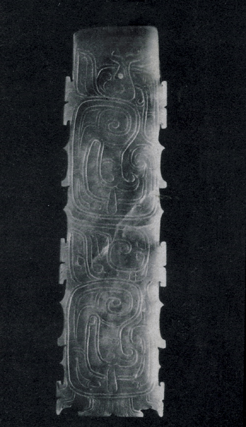 西周早期成康之際,玉珮常僅以陰線刻出大尾鳥紋,雕工簡練樸拙。我們細察清楚,就不難發覺與那時初期青銅器銘紋中的小鳥紋有很多大同小異的地方;如皆直喙、合翅,有垂下來的大尾。