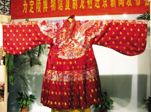 據《揚子晚報》報道,南京雲錦研究所是我國首批「一級可移動文物修復資質單位」和「甲級可移動文物技術保護設計單位」。自1979年以來,複製龍袍及匹料已達100多件。2006年1月雲錦研究所接受北京定陵博物館委託複製萬曆皇袍,歷經3年,完全按照明定陵出土的原件終於複製成功。
