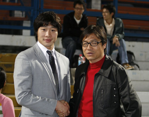 圖:南華新外援金永健(左)昨晚現身旺角場,旁為南華領隊金判坤(本報攝)