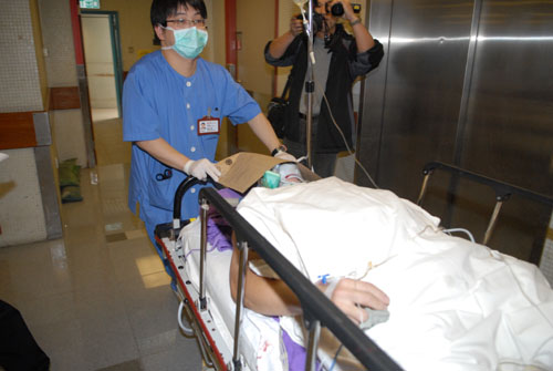 好彩趕及救護車尚未離去,救護員聞訊即時登車取下搶救心臟病人的「電擊」器,急步跑入麵包店協助救人。在梁醫生從旁協助下,以電擊器替已沒有呼吸及脈搏的事主接連三次電擊,令他回復呼吸脈搏。雖然病人沒有清醒,但初步保住性命。由於救人要緊,救護員請示上級後,將這宗個案列為優先處理,即時將他送往瑪麗醫院搶救,梁時勁醫生陪同。召救護車的女病人,則由另一輛救護車轉送醫院。