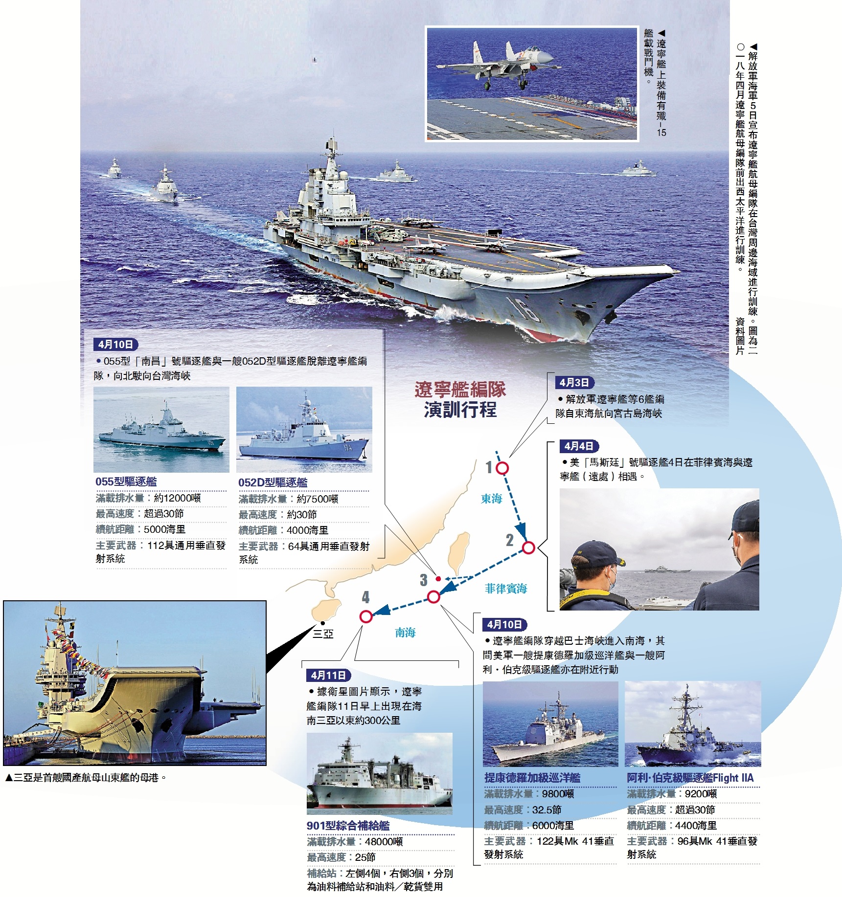 遼寧艦航母編隊此次在台灣周邊海域進行訓練,被軍迷稱為「長子出征」。因為編隊的6艘艦艇中,包括中國第一艘航母遼寧艦、第一艘「萬噸大驅」055型南昌艦、第一艘「航母奶媽」901型綜合補給艦呼倫湖艦,其中南昌艦是第一次與遼寧艦合組編隊。編隊其餘成員還包括兩艘「中華神盾」052D型導彈驅逐艦成都艦、太原艦,以及航母「貼身侍衛」054A型導彈護衛艦黃岡艦,均是各艦種中最先進的主力艦。