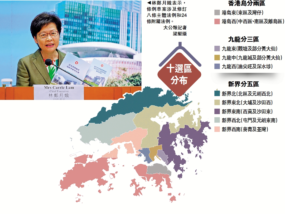 行政會議昨日通過《2021年完善選舉制度(綜合修訂)條例草案》(新選制草案)並刊憲,條例草案提出六大範疇的內容修訂(見表),今日將提交立法會在特別會議上首讀和二讀。根據修訂,立會選舉地方選區將由五個變成十個,特區政府冀每個選區的人口分布平均。