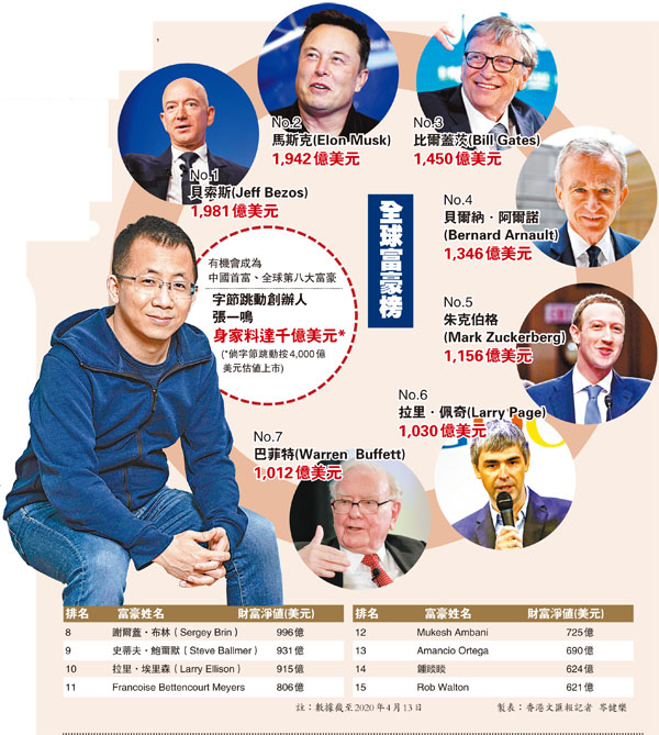 新經濟股將再現創富神話。據內媒引述消息指,抖音及TikTok的母公司字節跳動啟動了赴香港上市的程序,估值或高達4,000億美元(折合約3.12萬億港元)。令人感興趣的是,若字節跳動成功以4,000億美元估值上市,持股25%的38歲創辦人張一鳴,身家將增至1,000億美元(約7,800億港元),超越農夫山泉(9633)主席鍾睒睒(約624億美元),成為中國首富,同時亦晉身全球第八大富豪,排名「股神」巴菲特之後。 ●香港文匯報記者 岑健樂