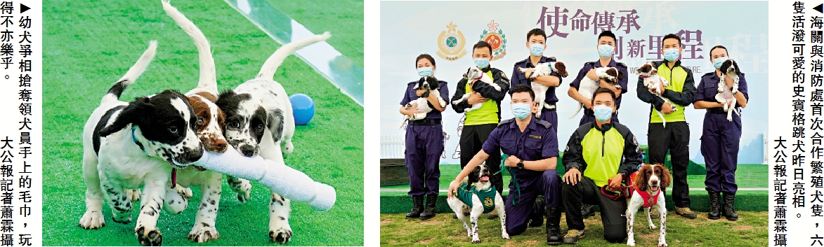 【大公報訊】記者葉浩源報道:香港海關與消防處首次合作繁殖犬隻,六隻兩個多月大的史賓格跳犬昨日於記者會上亮相,在台上蹦蹦跳跳,活潑可愛,牠們長大後將成為海關緝毒犬或消防處搜救犬。因應疫情關係,部門去年停止派員外購工作犬,遂促成這次合作繁殖計劃。另外,有見近年山野意外增多,消防處將重點培訓搜救犬搜索失蹤人士。