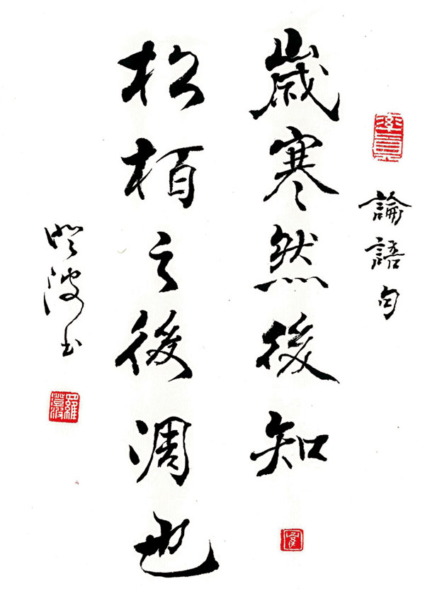 上面的經典名句出自《論語·子罕篇》。孔子以耐寒的松樹和柏樹比擬經得起考驗的君子。「凋」,凋謝。(亦可按松、柏的特質,將「後凋」理解為「不會凋謝」。)全句的意思是:到了寒冬,才曉得松柏是最後凋落的。意指在考驗到來的時候,才顯出情操高尚的君子實在與眾不同。