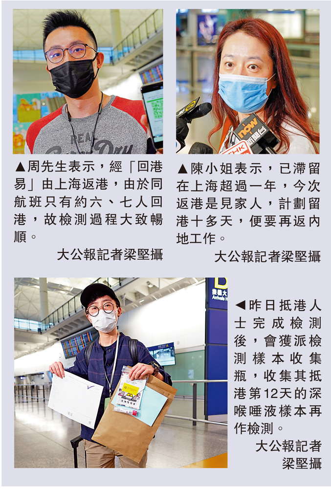 從事私募基金工作的周先生,也是經「回港易」由上海返港,他透露,航班上只有約20多人,但大部分也是轉機客,回港只有大概六、七人,因人數少,故檢測過程大致暢順。