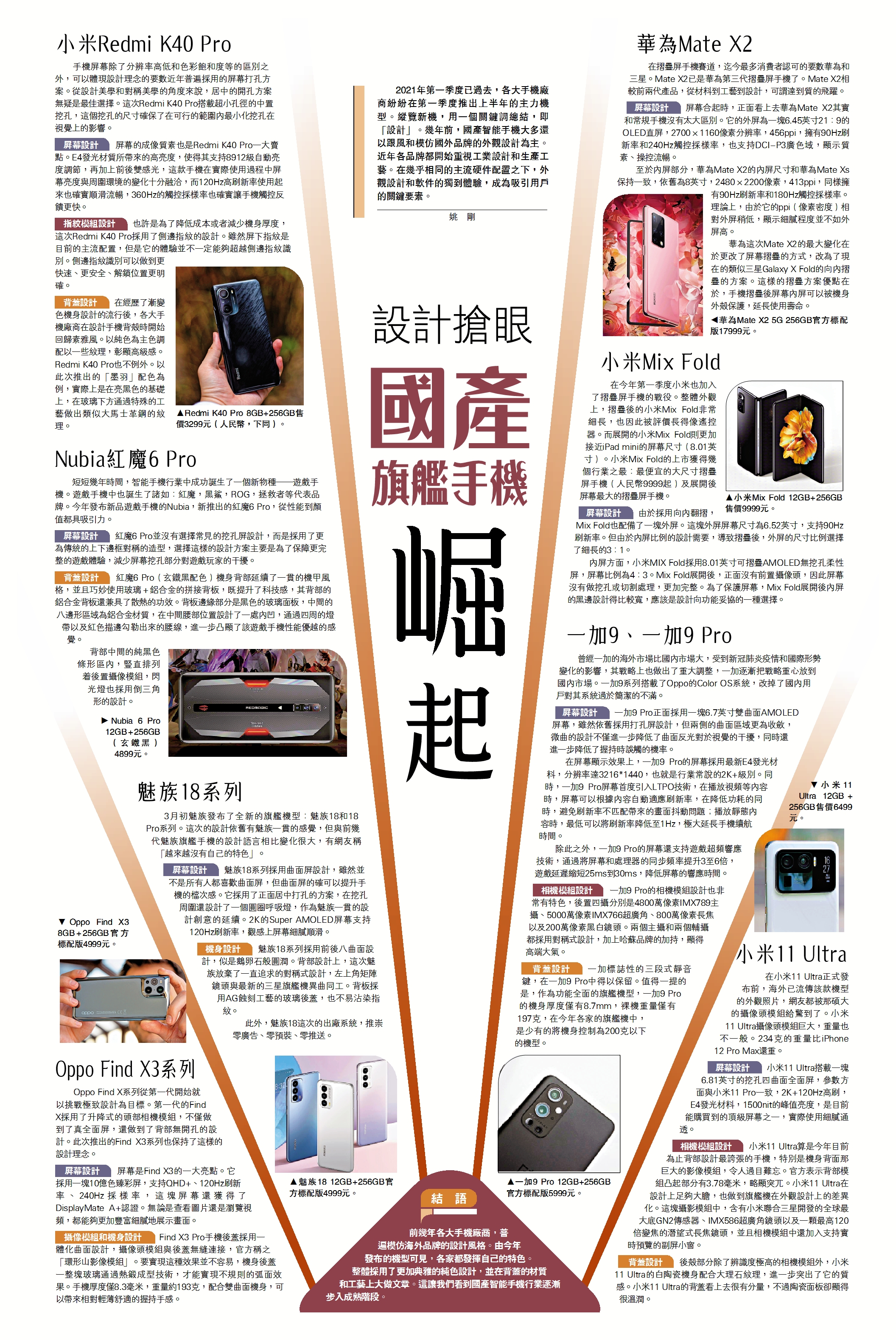 2021年第一季度已過去,各大手機廠商紛紛在第一季度推出上半年的主力機型。縱覽新機,用一個關鍵詞總結,即「設計」。幾年前,國產智能手機大多還以跟風和模仿國外品牌的外觀設計為主。近年各品牌都開始重視工業設計和生產工藝。在幾乎相同的主流硬件配置之下,外觀設計和軟件的獨到體驗,成為吸引用戶的關鍵要素。\姚 剛