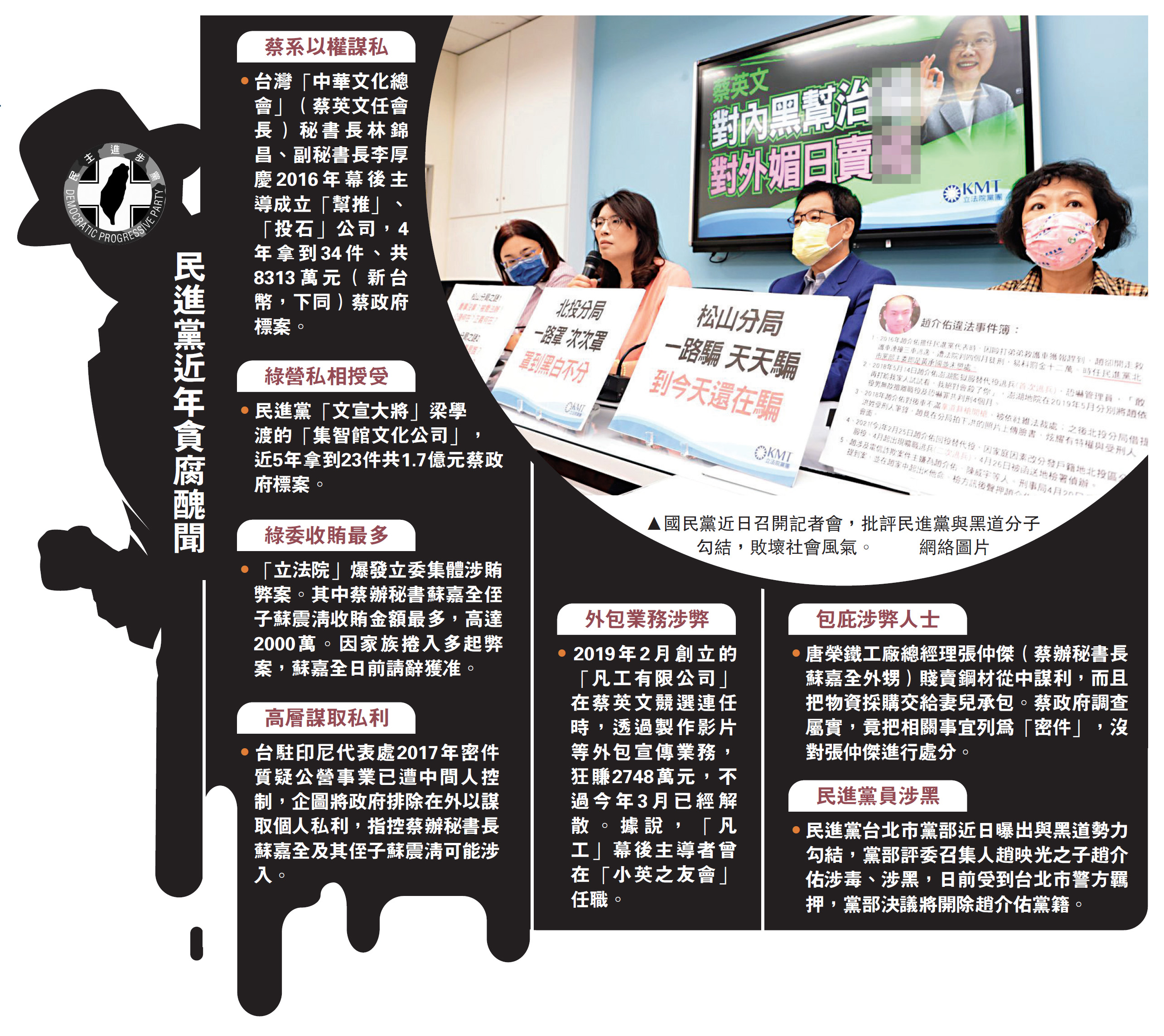 民進黨涉黑風波不斷延燒,擔任黨主席的台灣當局領導人蔡英文5日對此公開道歉。近日台媒揭發民進黨台北市黨部與黑道勢力勾結的醜聞。該黨部評委召集人趙映光之子趙介佑涉毒、涉黑,日前受到台北市警方羈押,黨部決議開除趙介佑黨籍。有台灣學者表示,政治人物與黑道勢力勾結的「黑金政治」在台灣由來已久,已成為台灣民主政治的一大污點。
