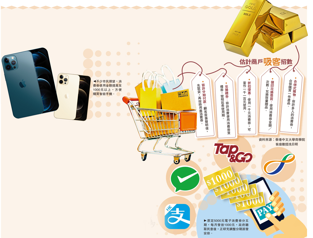 不少市民期望,消費券的每次使用金額,可以提高至1000以上,方便購買智能手機等高消費品。冼日明說,就算政府維持1000元為上限,商戶仍然可以容許客戶分期付款,「顧客只要簽署聲明,先取貨,才分幾期用盡消費券,就不用顧慮金額上限。」
