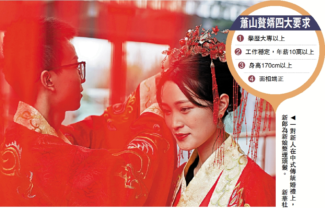 位於浙江杭州錢塘江南岸的蕭山,是充滿財富和希望的「贅婿天堂」,這裏有一家22年來以介紹上門女婿為特色的「金點子」婚介所,因為「專業招贅」登上熱搜,每天上百個報名「求入贅」的電話接踵而來,老闆李繼延不得不在朋友圈急發通知:名額已滿,暫停報名。近年,招贅婿條件有所提高,不僅要學歷高,更要愛工作顧家。\大公報記者 俞晝