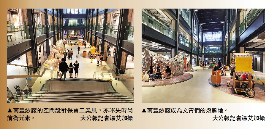 南豐紗廠的活化,盡可能保留了過去的部分特色及設計,如舊有綠色油漬的牆身、選用舊式鐵框窗戶、南豐紡織品牌「金杯」圖案的鐵閘,以及五廠鐵閘、四廠樓梯也獲得保留等。令人驚喜的小細節還有外牆的「南豐紡織有限公司」的標誌字型沿用式微工藝重新製作。護舊納新,紗廠的中庭運用了大量玻璃,而頂部也設天窗引進自然光,從設計上,讓傳統工業風建築多了一份前衛時尚的氣息。