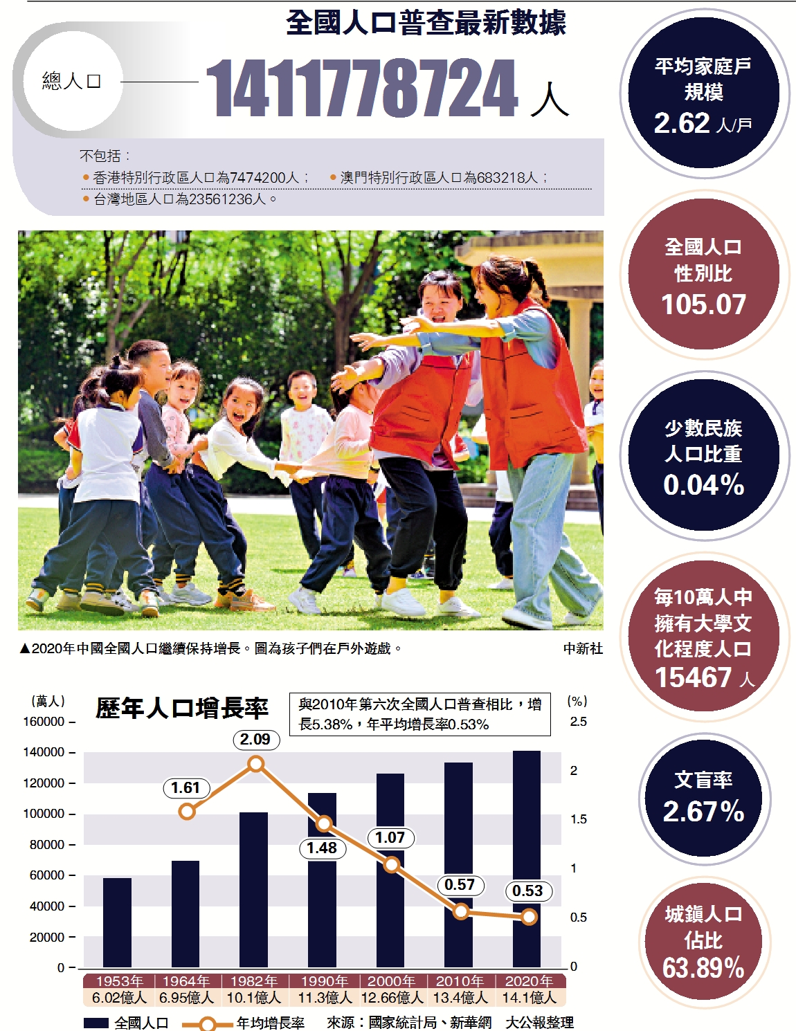 國家統計局5月11日在國新辦發布的第七次全國人口普查(以下簡稱七普)數據顯示,2020年全國人口有141178萬人,繼續保持增長,相比2010年第六次全國人口普查數據的133972萬人增加7206萬人,增長5.38%,年平均增長率為0.53%,中國仍為世界第一人口大國。多位專家對大公報指出,從人口及勞動力上看,粵港澳大灣區一方面人口增長較多,另一方面,整體年齡結構較其他地區更為年輕,年富力強佔優勢。\大公報記者 張帥北京報道