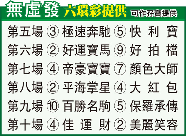 第五場「極速奔馳」上次再出跟前跑第二名不敵「勝賢」,前駒上三班都力拚得第二名,證明賽事水準唔弱,今次強手已去應到坐正之時。「快利寶」今季評五十分一出即勝谷草一哩,目前評四十九分已重拾優勢,近兩場千二米都追得似模似樣,今次加程跑千四米肯定合腳法,冷味十足。