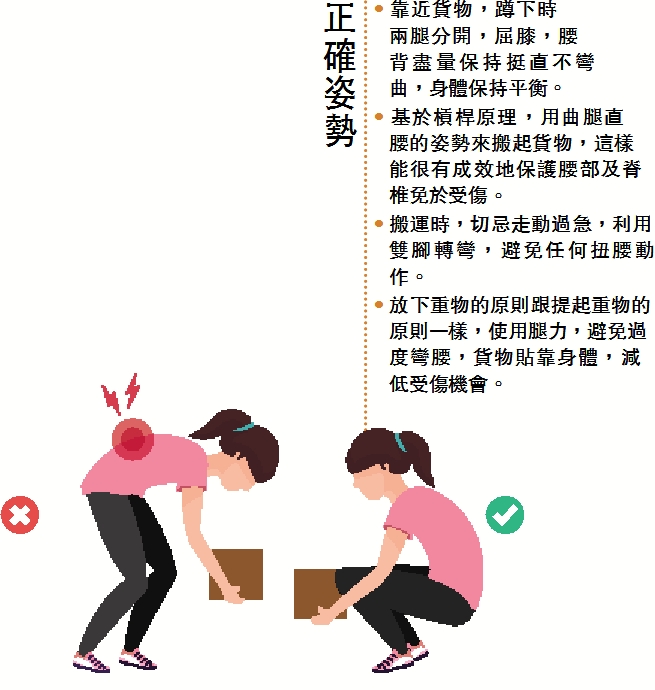 •基於槓桿原理,用曲腿直腰的姿勢來搬起貨物,這樣能很有成效地保護腰部及脊椎免於受傷。