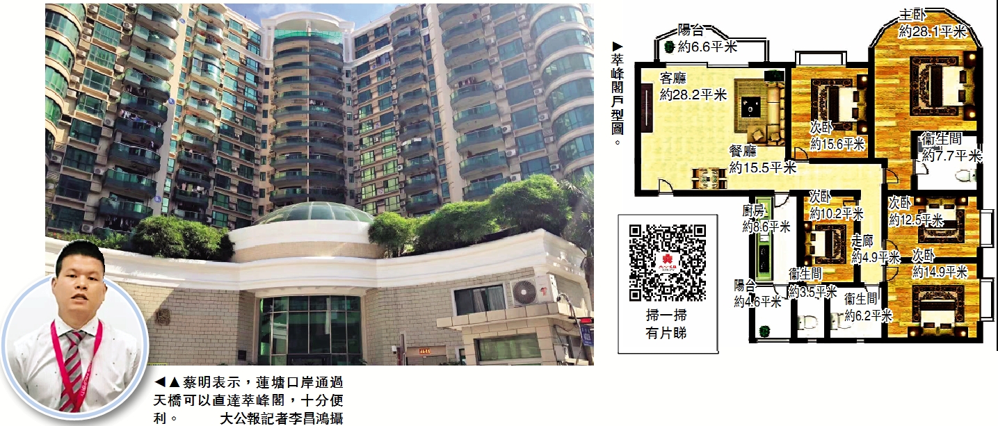 回港方便,單價性價比高,蓮塘大型戶房產許久以前已備受港人追捧。在蓮塘口岸和地鐵8號線去年開通後,更有利該片區許多房產的保值和增值。中原地產蓮塘片區物業顧問蔡明分析,蓮塘片區周邊除了蓮塘口岸,距離羅湖口岸和文錦渡口岸也非常近,投資該區物業具有較好的升值空間。其中,蓮塘口岸通過天橋可直達的萃峰閣性價比最高,每平米不到4萬元(人民幣,下同),主要戶型178至228平米,約800萬元即可入場。\大公報記者 李昌鴻