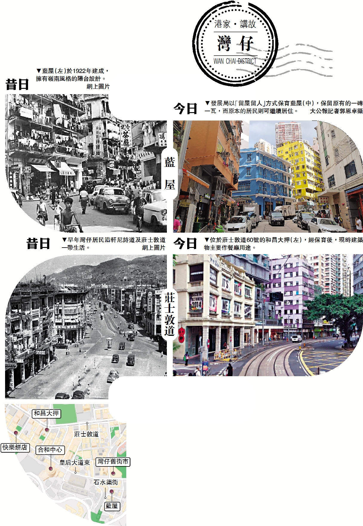 自19世紀,在香港的英國人及其他外國人多居於中環,華人則在灣仔一帶聚居,因此灣仔擁有很多具平民生活色彩的店舖和建築,和昌大押、藍屋、利東街都是灣仔的地標。但隨着近年灣仔區重建,納米豪宅和高消費商店紛紛進駐區內,令灣仔蛻變成為新舊共融的社區。見證灣仔時代變遷的快樂餅店老闆王少平說:「還是喜歡昔日的灣仔,街坊感情好好,人情味濃!」