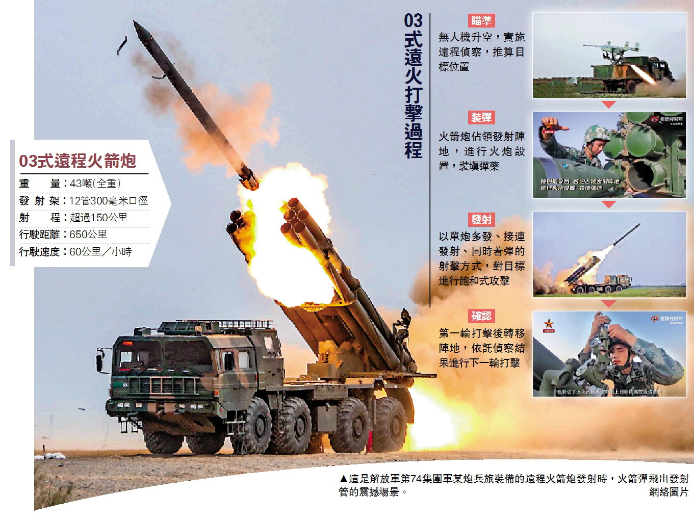陸軍官兵首先依託無人機實施遠程偵察,推算目標位置。為克服海面目標的不穩定性,採取單炮多發、接連發射、同時着彈的射擊方式,以高強度火力對目標進行飽和式攻擊。有的海上移動船靶一擊即中,有的則是被多枚火箭炮彈覆蓋壓制摧毀。此次演習,不僅展示了03式遠火攻擊海上移動靶標的能力,也檢驗了陸軍的反艦戰力。