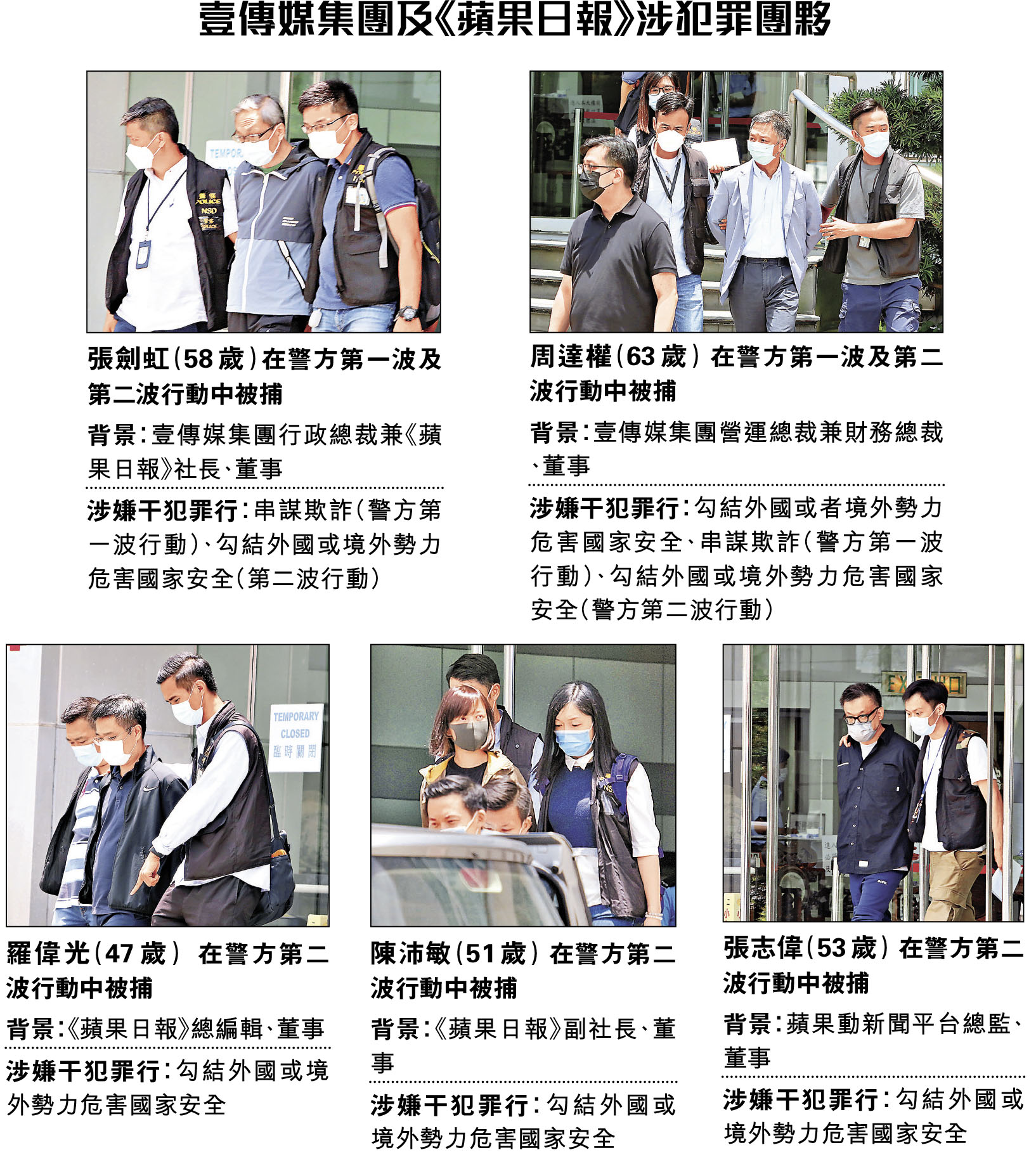昨日被捕的4男1女,分別為壹傳媒集團行政總裁兼《蘋果》社長張劍虹(58歲)、營運總裁兼財務總裁周達權(63歲)、《蘋果》副社長陳沛敏(女,51歲)、《蘋果》總編輯羅偉光(47歲)及蘋果動新聞平台總監張志偉(53歲)。5人均為《蘋果日報》有限公司、《蘋果日報》印刷有限公司的董事,而張劍虹和周達權則身兼蘋果互聯網有限公司董事,保安局局長已凍結該3間公司合共1,800萬元的犯罪資產。
