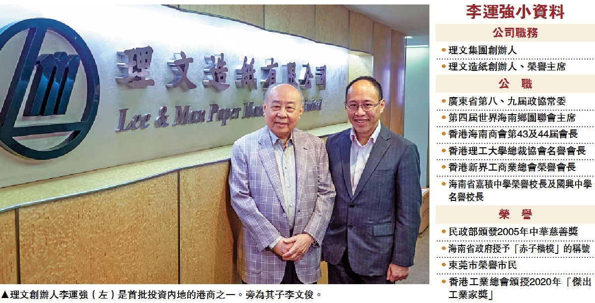 今年是中共建黨百周年,理文集團創辦人李運強倍感親切,因為其家族與中共的淵源甚深,舅父是東江縱隊連長,不少軍隊首長曾住宿其家,故對內地知之甚深,睇好國家前景。「點解1979年咁早我就返東莞設廠,因為我好多親戚係黨員,自己又做過少先隊長,好了解黨的情況,睇好內地人工低的優勢,見到當時內地好窮,希望幫下就業和促進發展,更堅信國家會富強起來。」懷抱一顆愛國之心,李運強率先北上投資,並且不斷加碼,食正國家經濟騰飛大機遇的他,更是登上手袋大王及造紙大王的寶座。