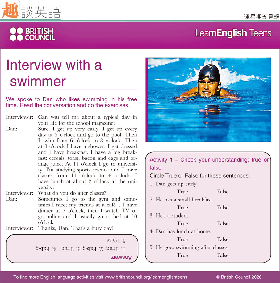 We spoke to Dan who likes swimming in his free time. Read the conversation and do the exercises.