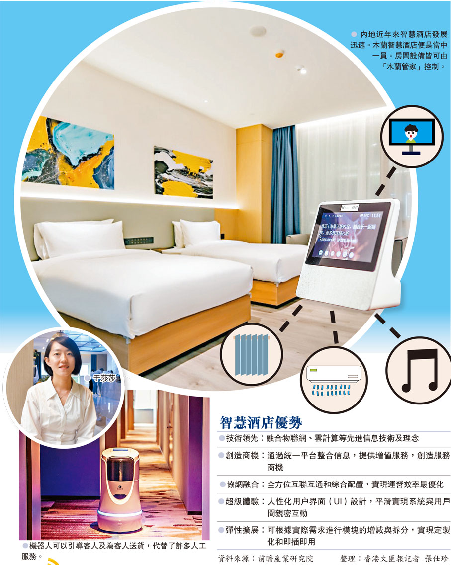 進入木蘭智慧酒店的大堂,首先映入眼簾的就是一個智能前台和一台機器人。「我們從入住就開始實現智能。有預訂的旅客,只需要放身份證人臉識別就可以取房卡,整個過程25秒左右即可完成。」木蘭智慧酒店總經理于莎莎向香港文匯報記者介紹,即使是沒有預訂的旅客,也就是在選房和支付的時候多花一點點時間,總體也非常快。