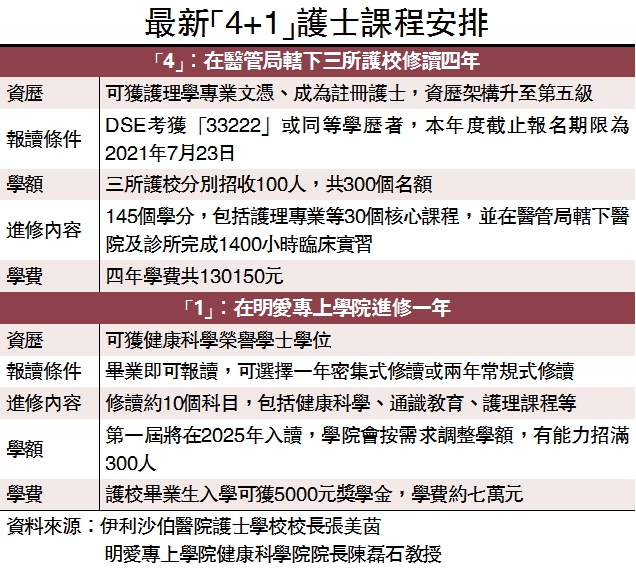 醫管局轄下的明愛醫院、伊利沙伯醫院及屯門醫院護士學校自2008年起,提供為期三年的護理學高級文憑課程。今年起,三所護校將與明愛專上學院合作,推出全新的「4+1」護士課程。學生讀滿四年才能做註冊護士,但資歷升格為專業文憑,資歷架構升一級至第五級。如順利畢業,可無縫銜接到明愛專上學院進修健康科學榮譽學士,最快一年取得學位。