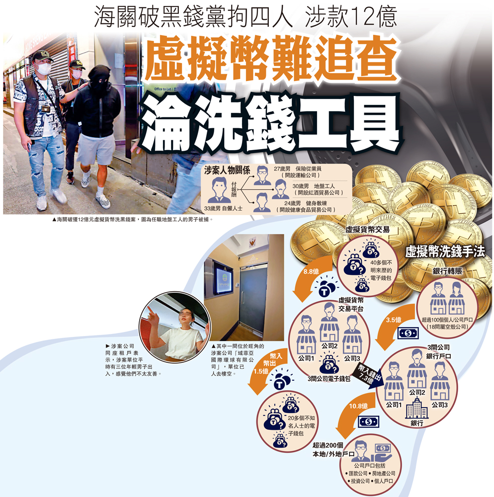 虛擬貨幣交易因有不記名特徵,成為不法之徒洗黑錢的新興工具。香港海關日前首破虛擬貨幣洗黑錢案,涉款高達12億港元,瓦解一個懷疑洗黑錢集團。案件涉及三間本地註冊公司,拘捕四名涉案男子,包括犯罪集團的骨幹成員,凍結合共2000萬港元。