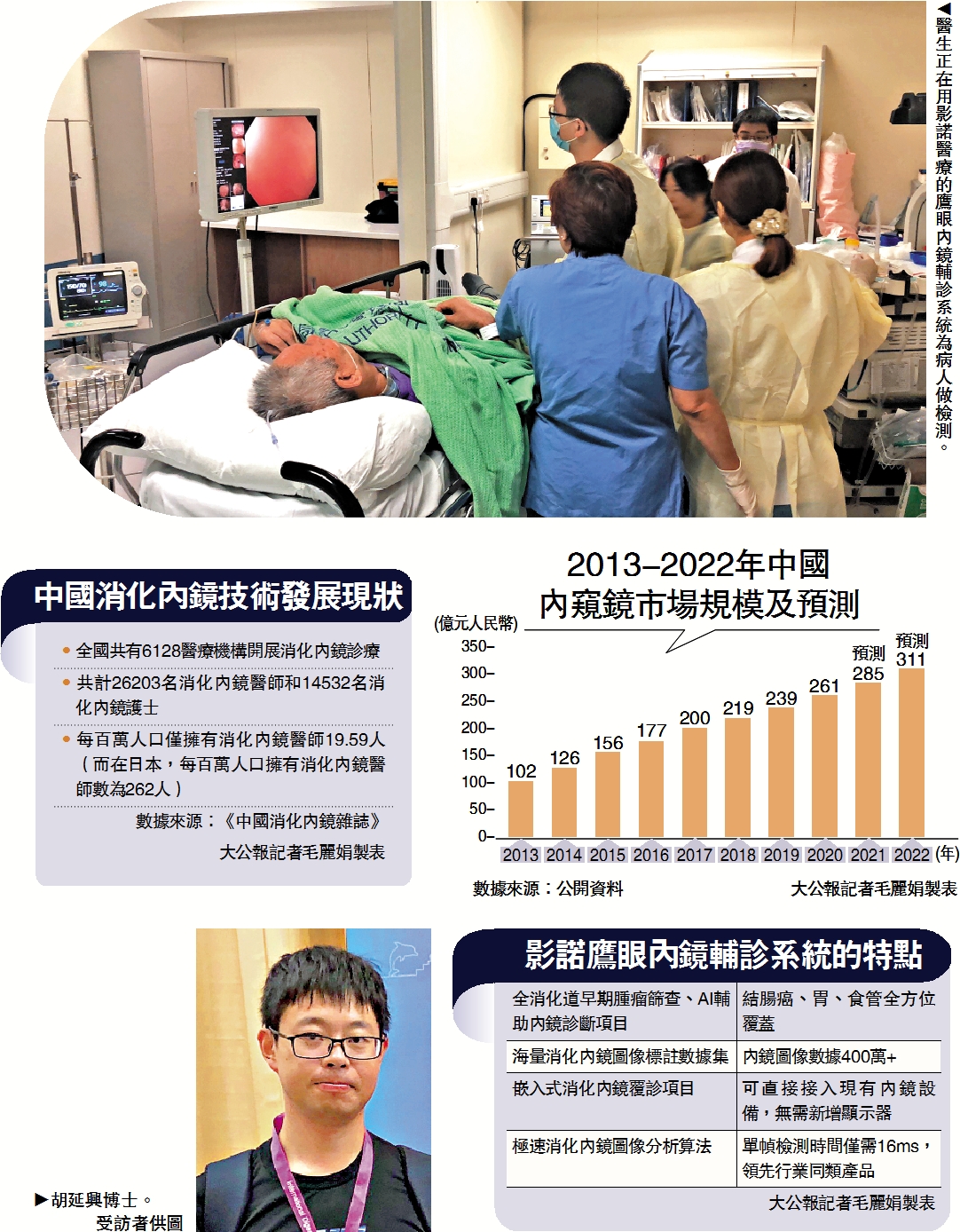 內地直腸癌新發病例和死亡人數分別佔內地惡性腫瘤新發病例和死亡人數的第三位及第五位,早篩、早診、早治已成為業界預防並治愈此類疾病的共識。畢業於香港理工大學的胡延興博士應用人工智能技術(AI),改良傳統的胃腸鏡,將胃腸癌檢測的準確率提高到了90%以上。他指出,內地消化內鏡診斷市場規模很大,如果適齡人口全部接受內鏡篩查,全年該醫療服務的市場規模逾200億元(人民幣,下同)左右。\大公報記者 毛麗娟